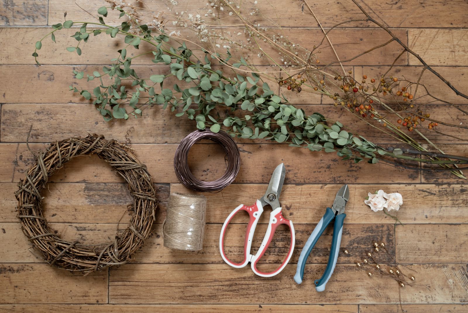 ドアや壁に掛けて、手軽に空間のイメージを変えられるリース。市販の土台に好きな花材を重ねていくだけなので、初心者でも簡単に、楽しみながらつくることができる。クリスマスのイメージが強いが、季節の花材でアレンジすれば、さまざまなイベントシーズンのインテリアに。今回使用したユーカリのようなグリーンをベースにした束は、全体的にボリュームが出てきれいにまとまりやすいのが魅力。松の葉や南天などの和素材を合わせれば、モダンな正月飾りにもぴったり。仕上げにリボンやプリザーブドフラワー、お気に入りのチャームなどを添えて、世界でひとつだけのリースをつくってみよう。