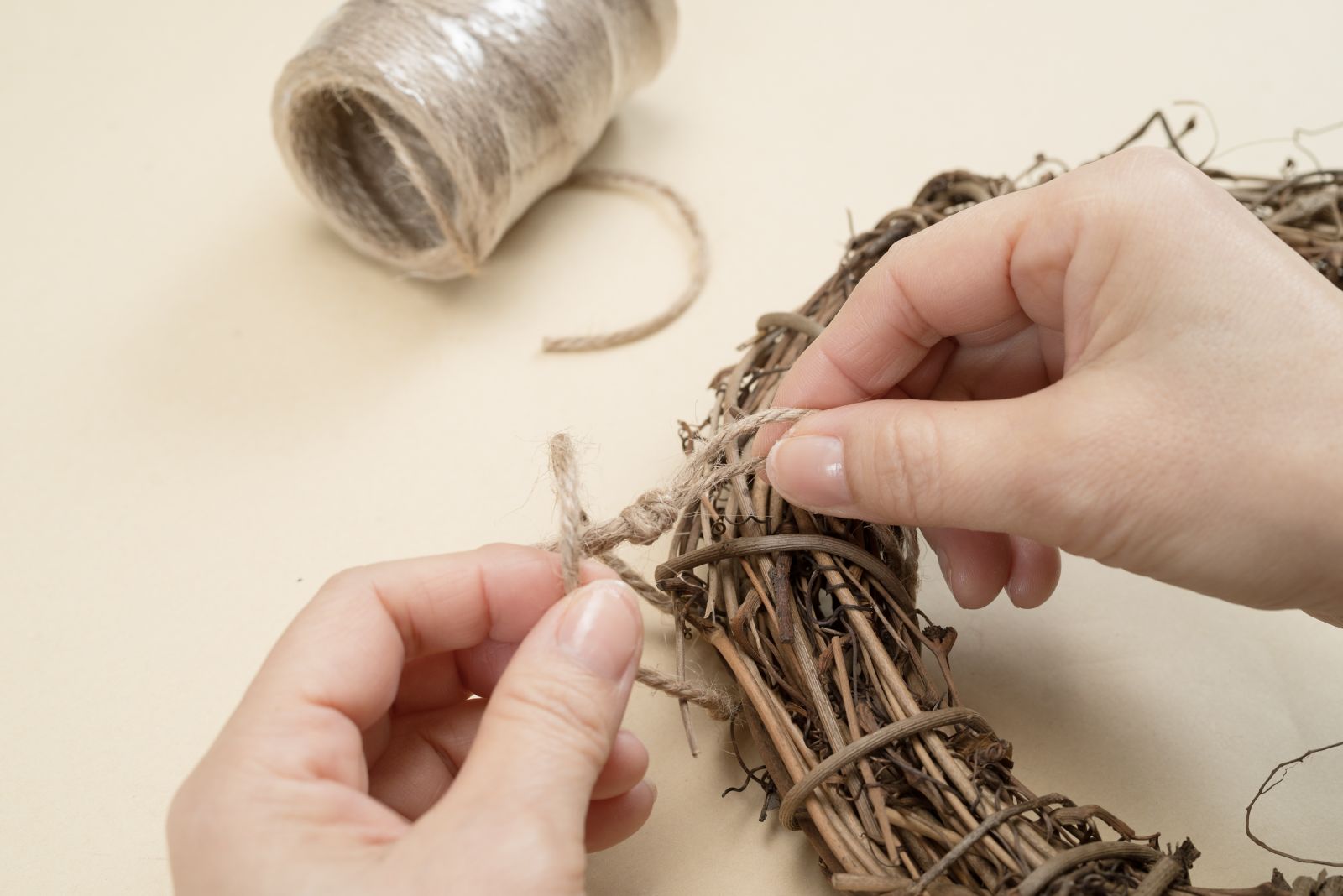 リース土台の上部にする場所に麻ひもを取り付け、吊り下げ部分を作る。