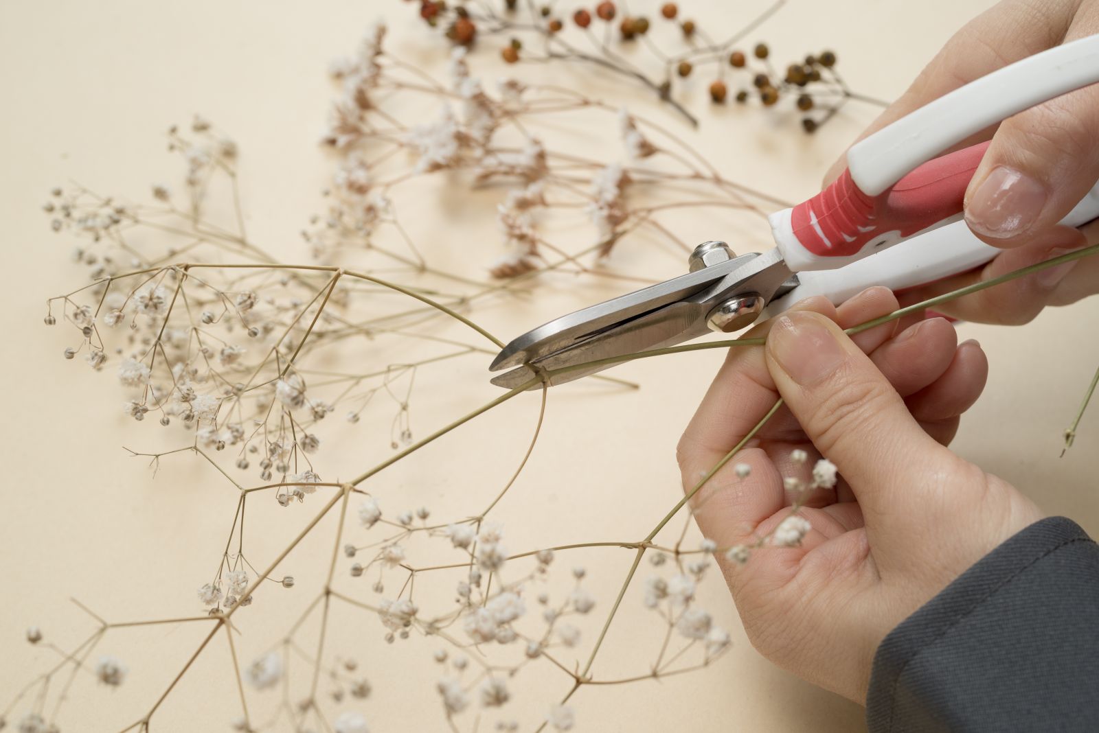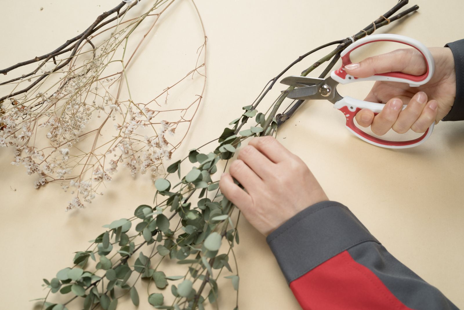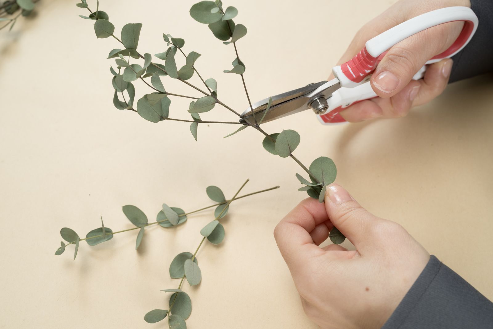 花バサミを使って、ユーカリやドライフラワーを扱いやすい長さにカットする。さらに、花や葉の部分を15cm程の長さにカットする。