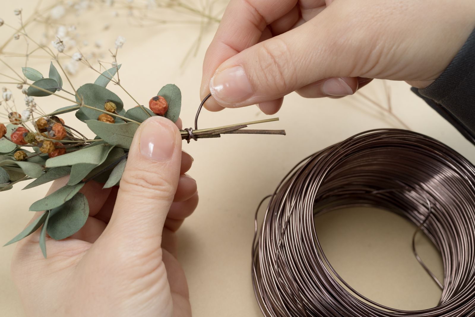 カットした花材を好みのイメージで束ねていく。束ねたワイヤーは、リースに巻き付ける分として約15cm残し、ニッパーでカット。束の数はリースのサイズや花材によって異なるため、仕上がりをイメージしながら調整を。今回は10束を用意。
