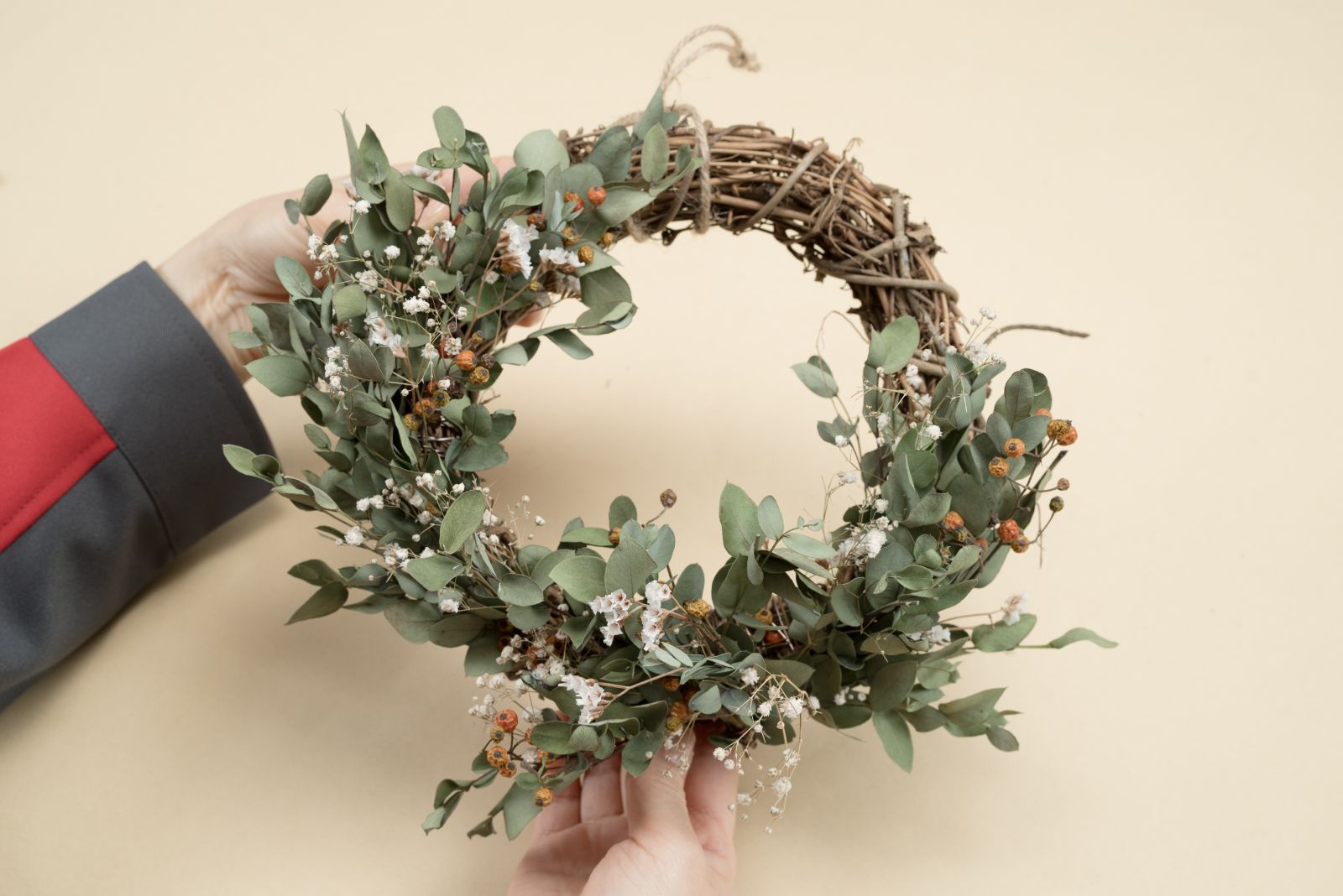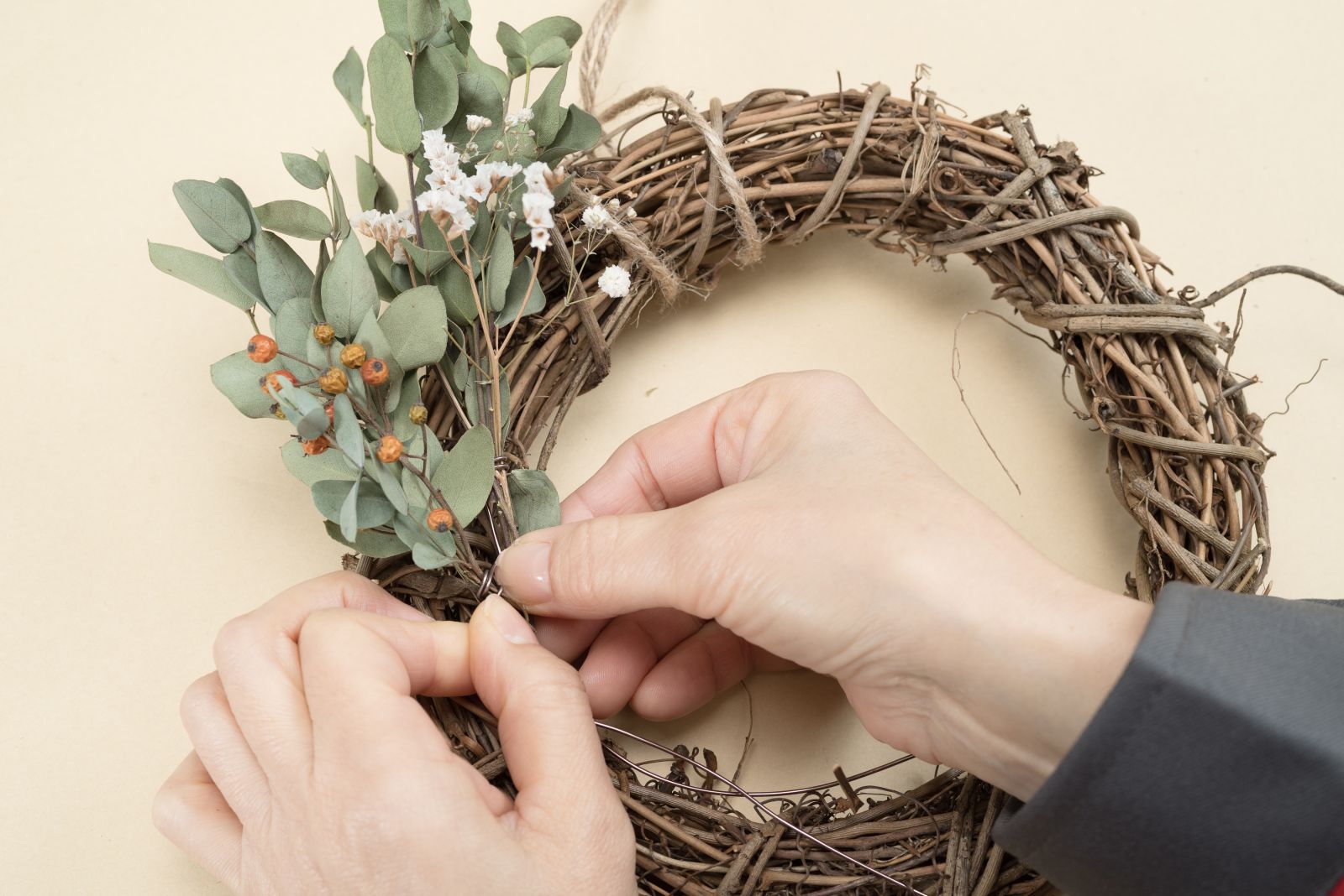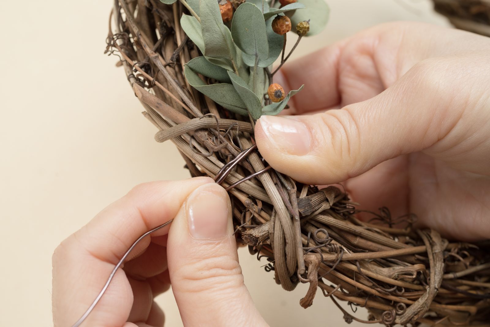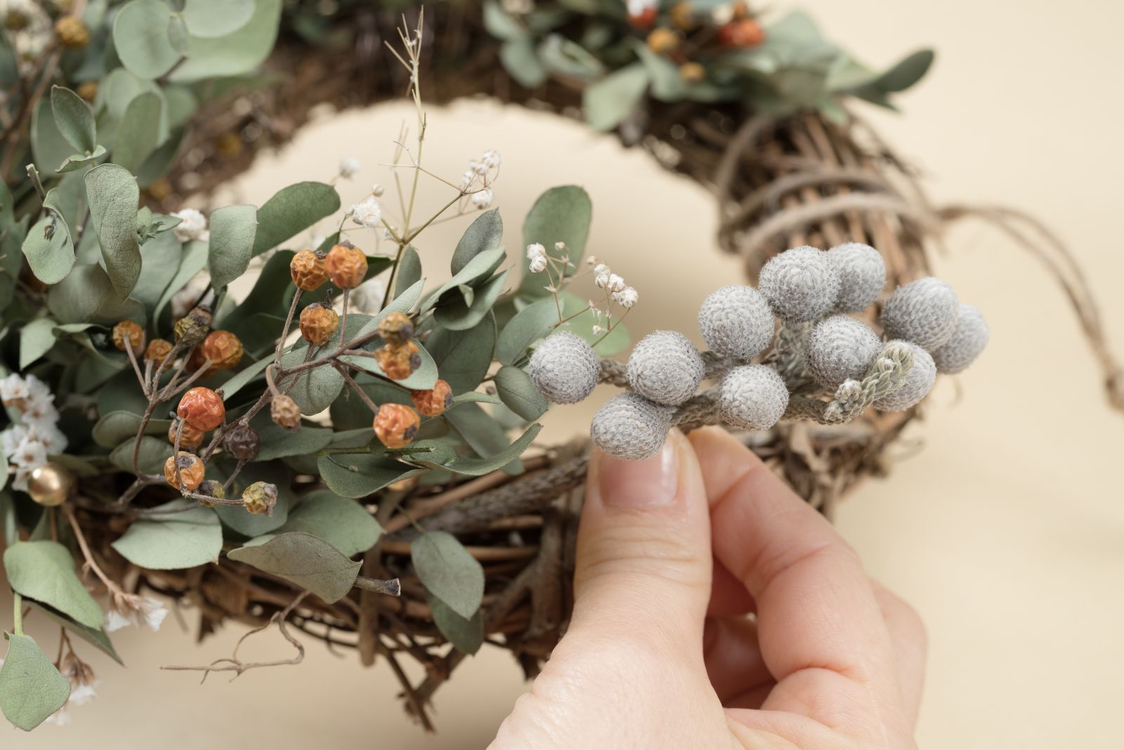 花材を固定したら、全体のバランスを見ながら飾りを付けていく。木の実や造花、リボンなど好きなアイテムで自由にアレンジを。飾りの向きを少しずつ変えると、より自然で動きのある印象に仕上がる。最後に余分なユーカリの葉を花ばさみでカットするなどして、全体を整える。