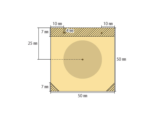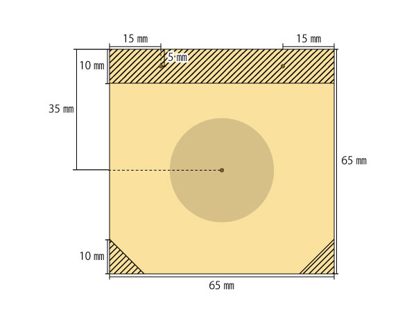 図案は大きめと小さめの2サイズ。手の大きさや使いやすさに合わせて、好みのサイズを選ぼう。選んだ図を参考にしながら、ゴム紐を取り付ける穴の位置と、角を切り取る部分に印を付ける。印を付けたら、のこぎりで角を切り落とし、竹用ドリル(3mm)を使ってゴム紐用の穴をあける。