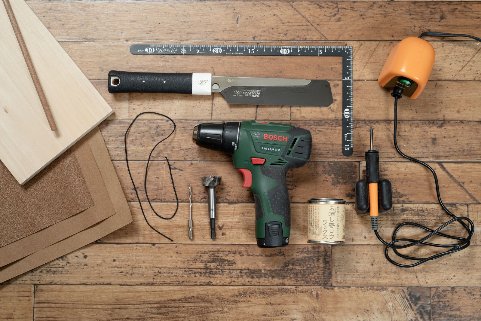 ●電動ドライバー、差し金、のこぎり、紙やすり、ゴム紐、ウエス、スポンジなど