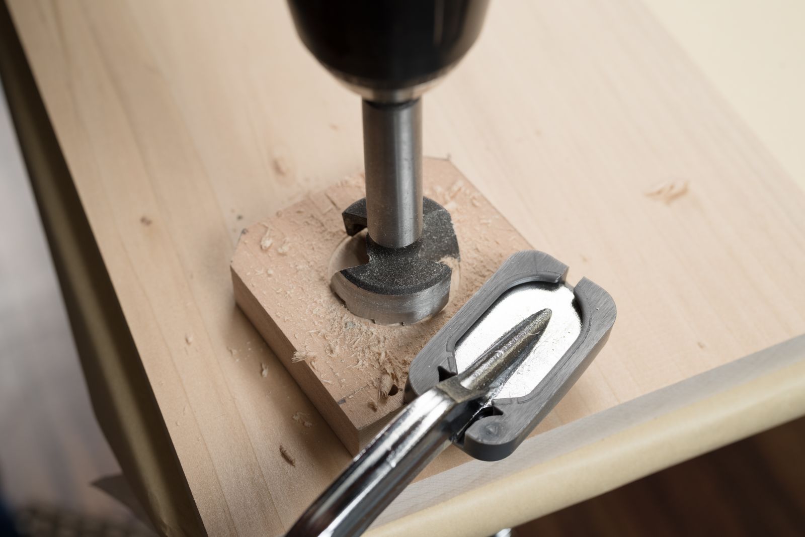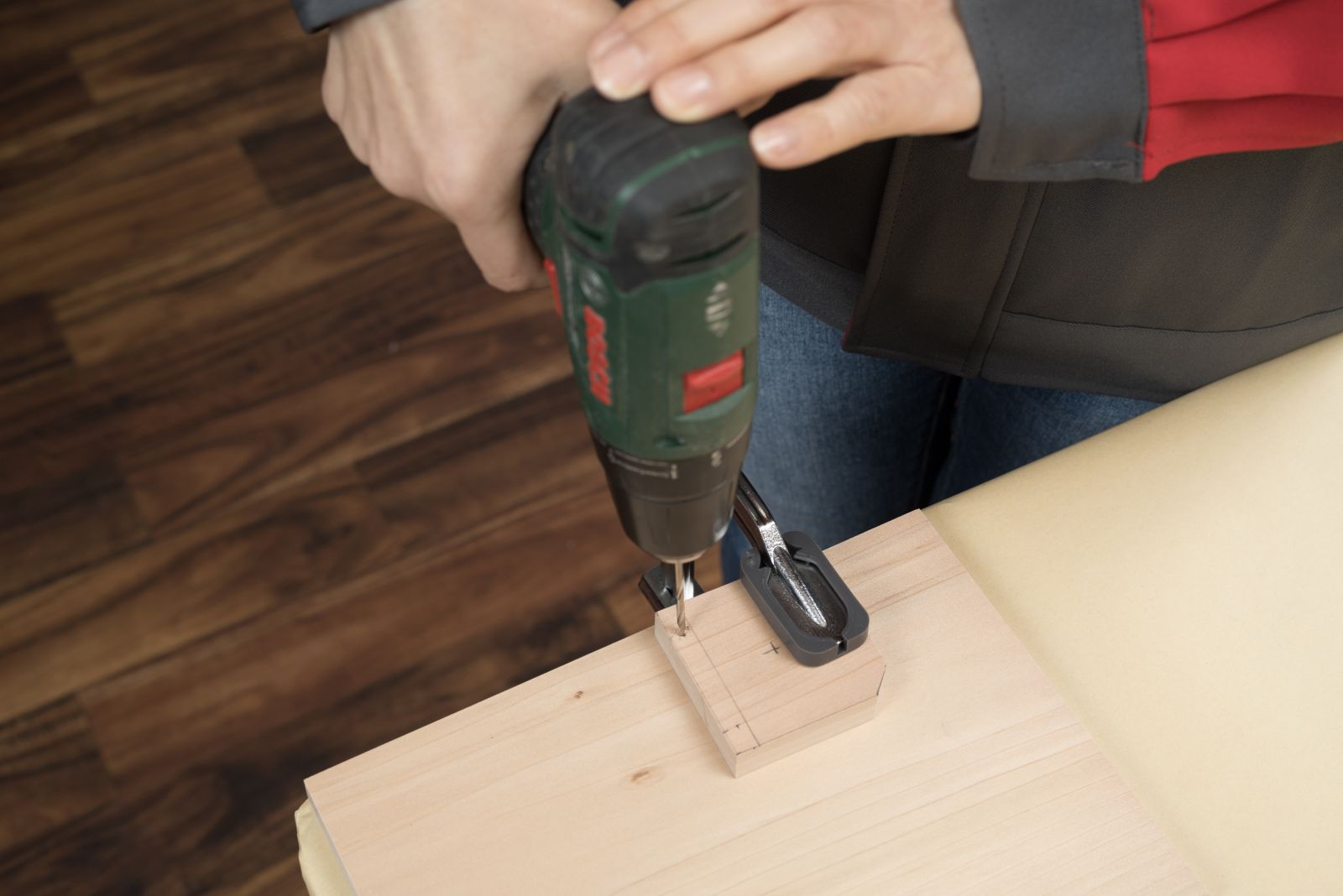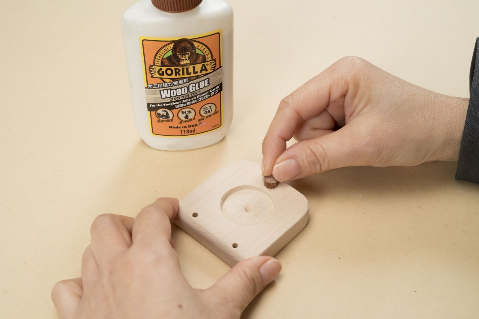 カスタネットの下側になるパーツの中央に、ボアビット(30mm)を使って深さ約3mmの穴をあけ、くぼみをつくる。くぼみを入れるのは1枚のみ。深さを確認しながら、慎重に作業を。角のカットや中央の穴あけが難しい場合は、省略して【3】の工程に進めても大丈夫。