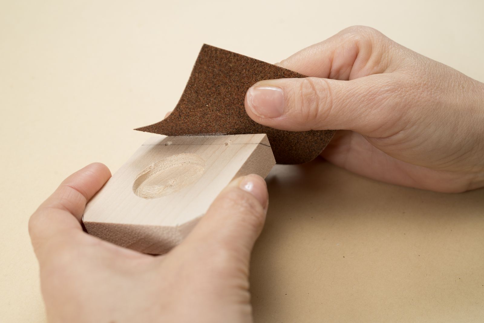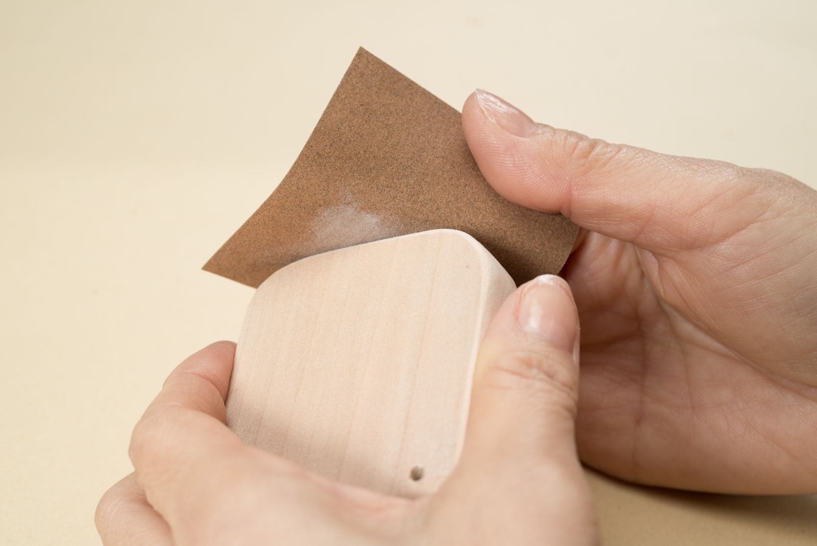 カットした部分とゴムひもの穴部分を中心にやすりをかける。角を丸くし、木のざらつきを取り除くことで、小さな子どもでも安心して使える仕上がりになる。