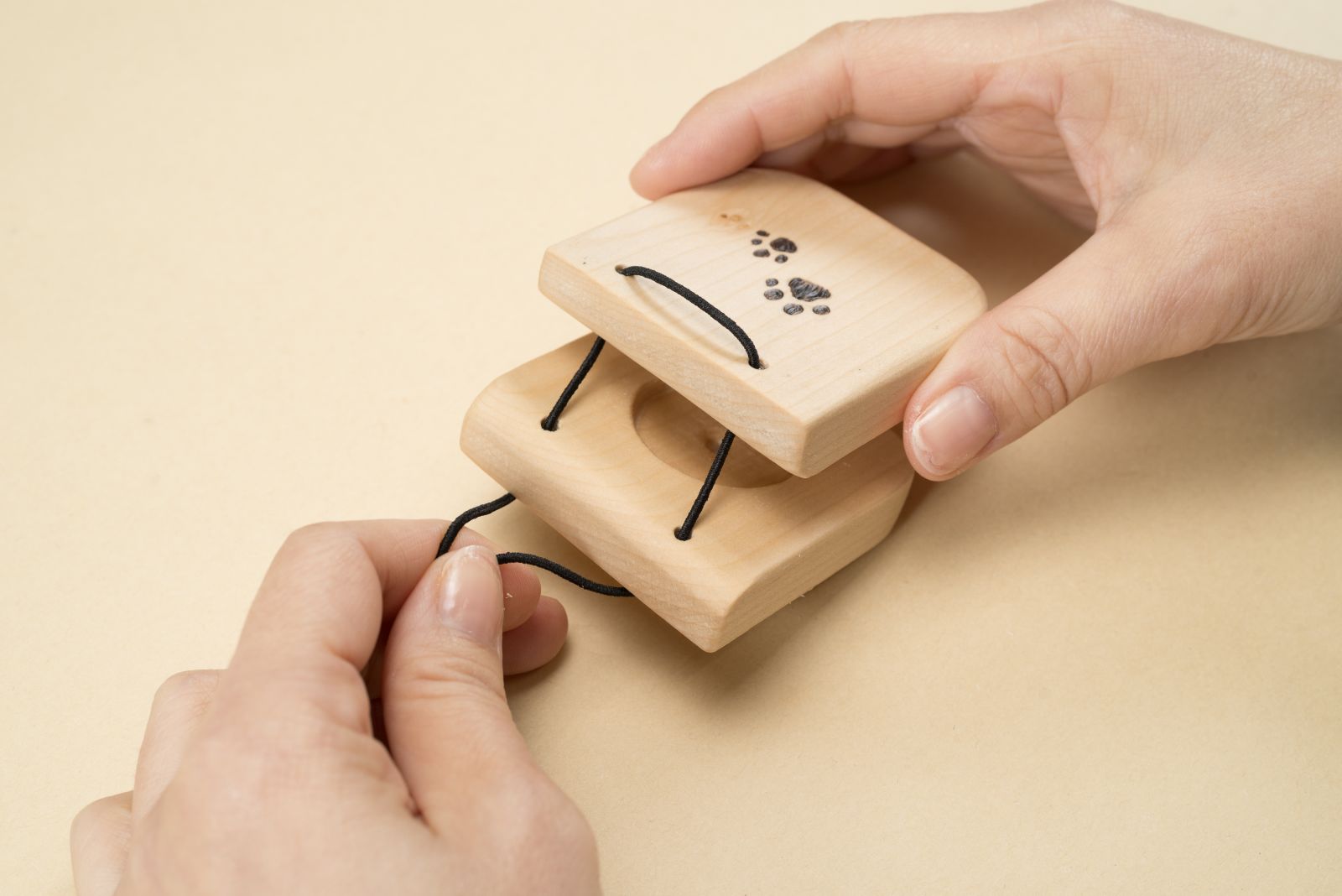 好みの木材でつくれるが、カスタネットをたたいた時に音が響きやすくなるよう、本体や打点に使う木材は、できるだけ堅めのものを選ぶのがおすすめ。ゴム紐は、本体が適度に開きつつ、ふたつの木材が離れないようにきつめに結ぶと使いやすい。