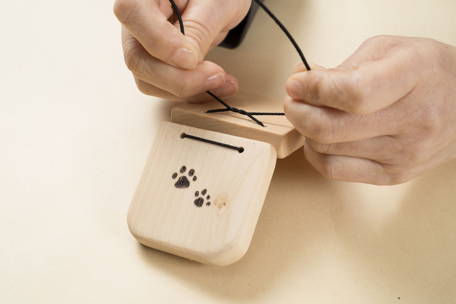 ゴム紐を穴に通し、上下のパーツを結び合わせる。開閉がスムーズにできることを確認しながら、張り具合を調整して少しきつめに結ぶ。最後に、ゴム紐の端を結んで親指通しをつくる。