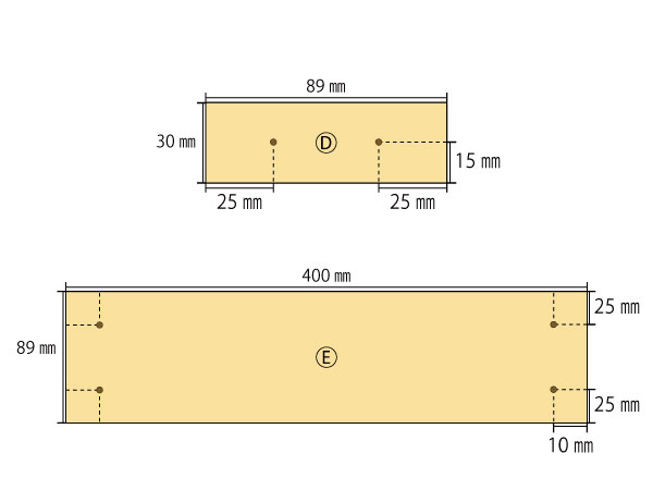 図1、2、3を参照して、(A)(D)(E)の穴をあける位置に印を付ける。脚になる(A)と天板の受けになる(D)に3mmの下穴を、天板(E)に皿取錐を使って8mmのダボ穴をあけたら、すべての材料にサンダーでやすり掛けをする。