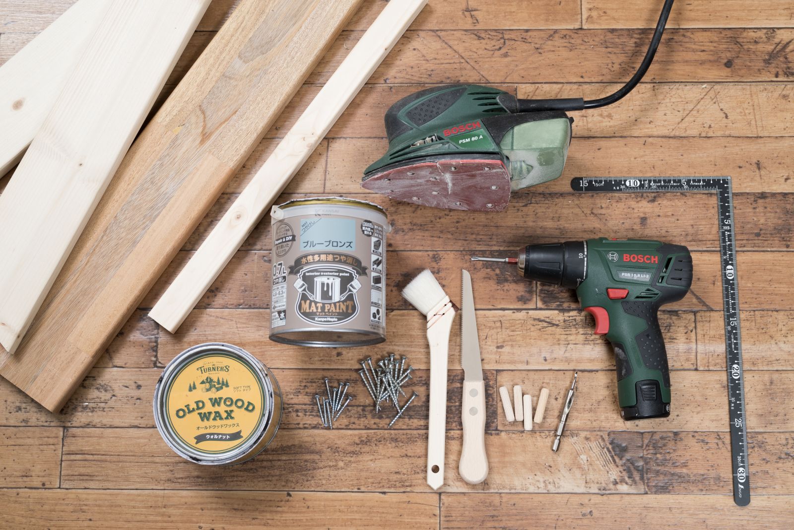 ●電動ドライバー、サンダー、差し金、皿取錐(8mm)、ダボ切り用のこ、プラハンマー、木工用接着剤、刷毛、ウエス、スポンジなど