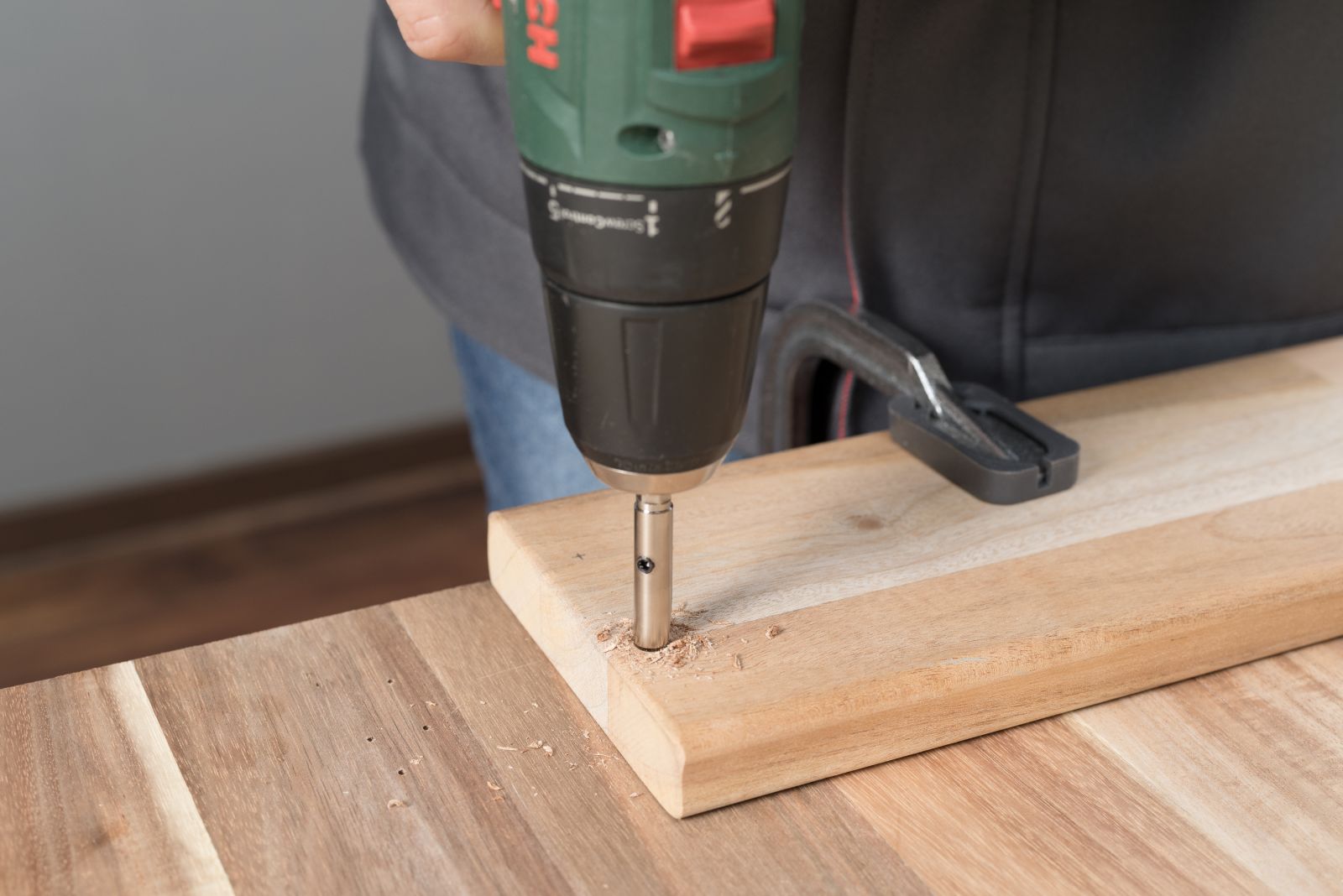 【1】下穴、ダボ穴をあけ、やすりをかける
