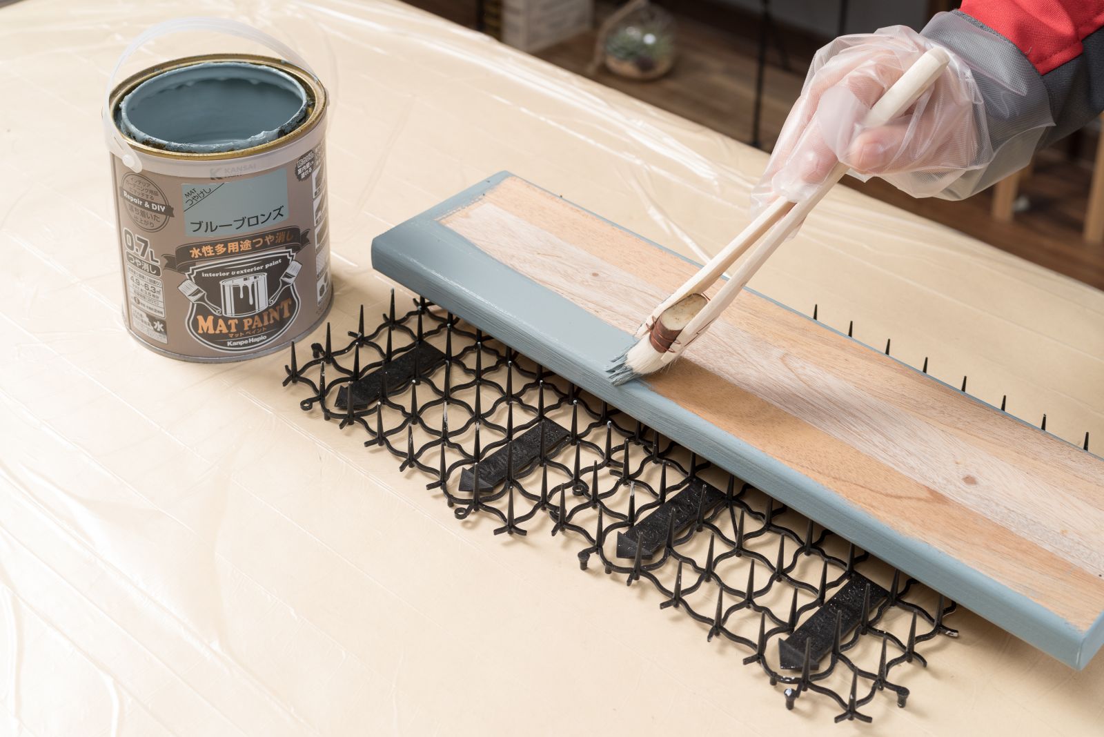 光沢がなく落ち着いた仕上がりになるマットペイント。水性塗料で乾燥が早く、木材の他にも鉄やコンクリート、プラスチックなどにも使えるのが特徴。多彩な色が揃っているので、オリジナリティのある作品づくりにぴったりの塗料だ。室内外で使えるが、水が直接かかるような場所での使用は避けたほうがベター。