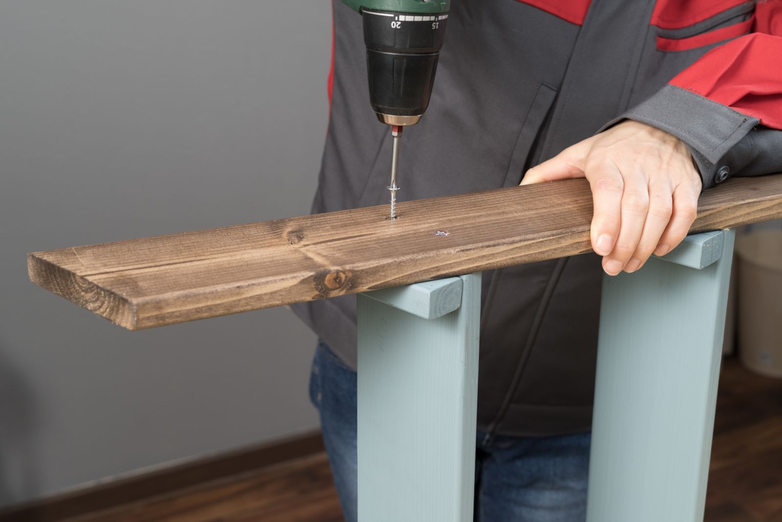 天板(E)は、ネジで取り付けた後、ネジ頭を隠す「ダボ隠し」をする。木工用接着剤を付けたダボ穴に8mmの木ダボを埋め、ダボ切用のこを使い、はみ出ているダボをカットする。その後、表面をマットペイントで塗装する。