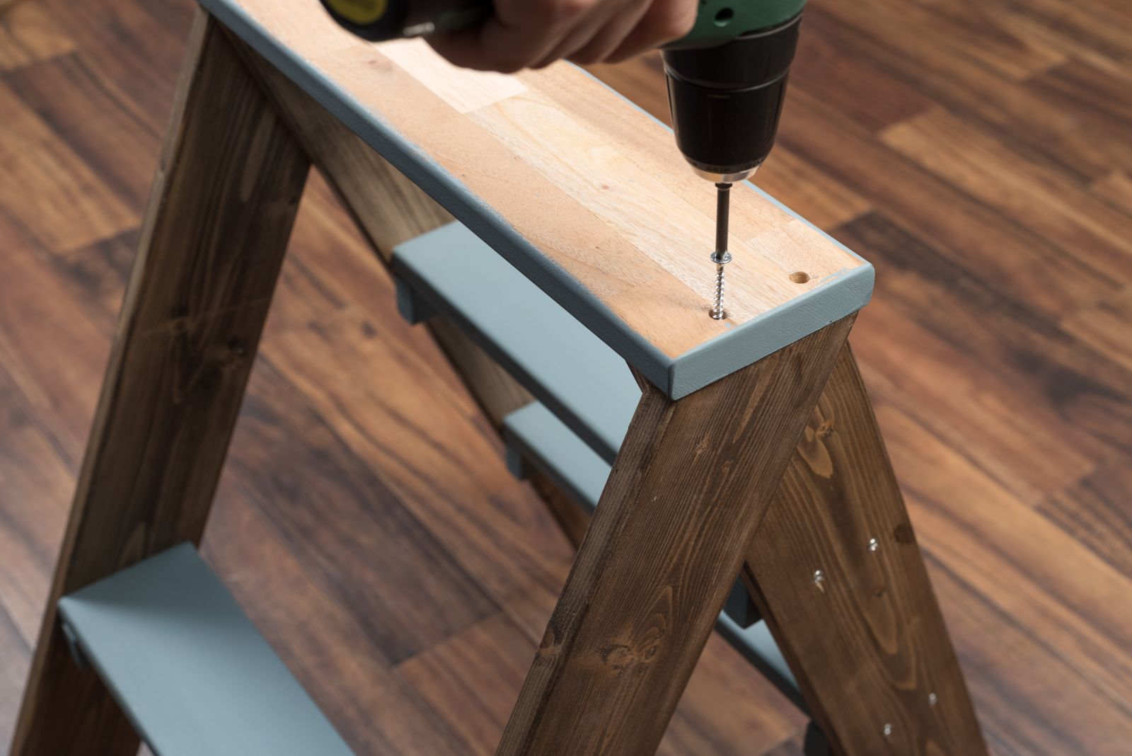 キッチンでの作業中にちょっと腰掛けてひと休みしたり、高い場所のものを取る際の踏み台にしたりと、便利に使えるステップチェア。木製ならではのナチュラルな雰囲気は、観葉植物や雑貨のディスプレイ台としてもよくなじむ。脚や踏み板に使用する1×4(ワンバイフォー)材は、DIY初心者でも扱いやすい木材。規格で決められたサイズで必要な長さにカットするだけなので、材料の準備も簡単。組み立てのポイントは、踏み板の受けと脚の取り付け。傾いたり、がたついたりしないよう、位置を確認しながら慎重に進めよう。仕上げに使用したマットペイントやオールドウッドワックスは、ある程度の耐水性があり、水回りでも使いやすい。