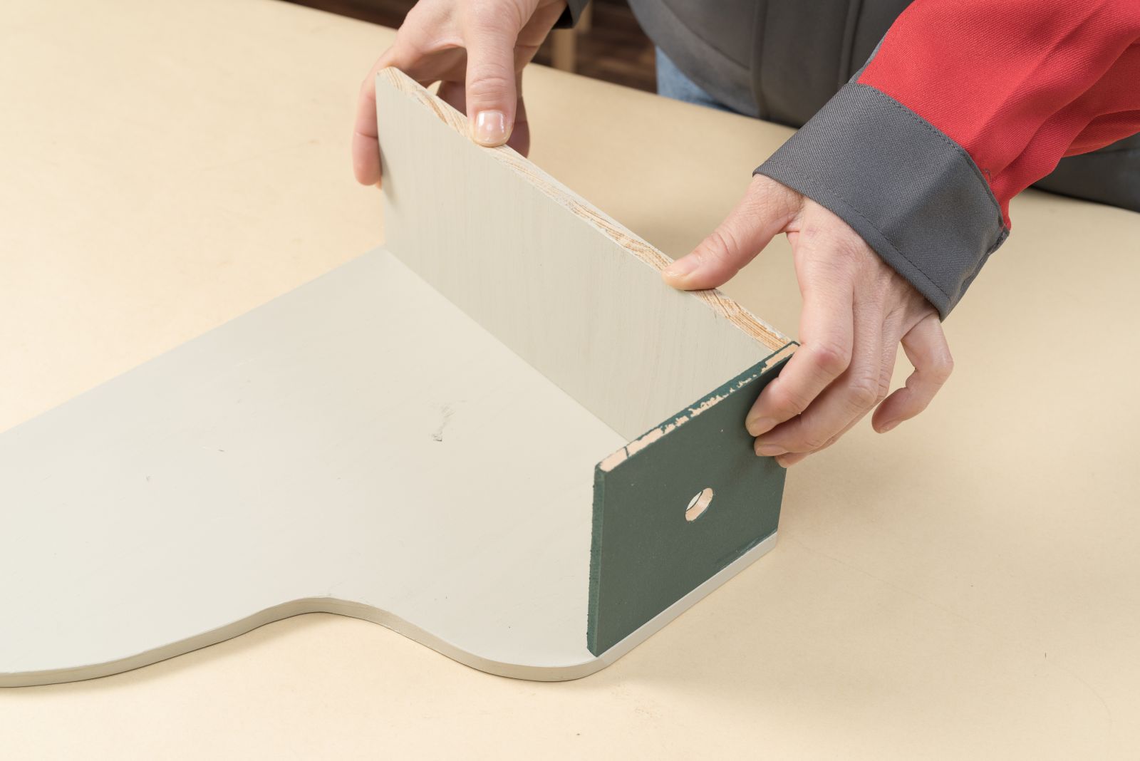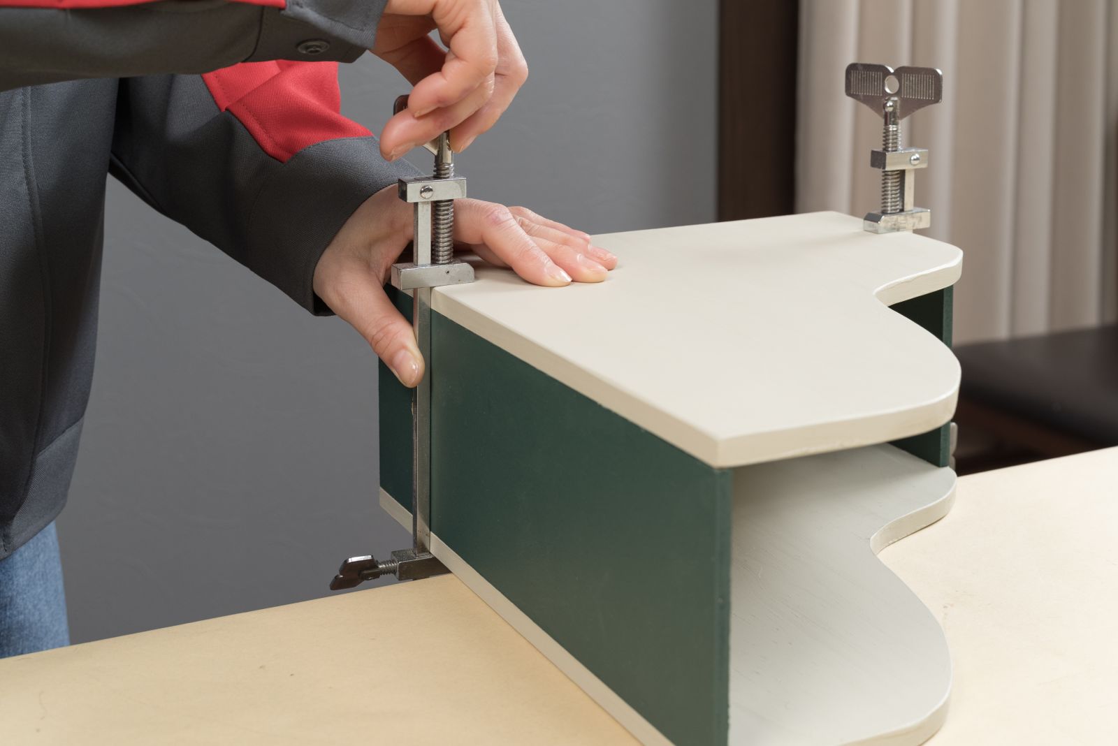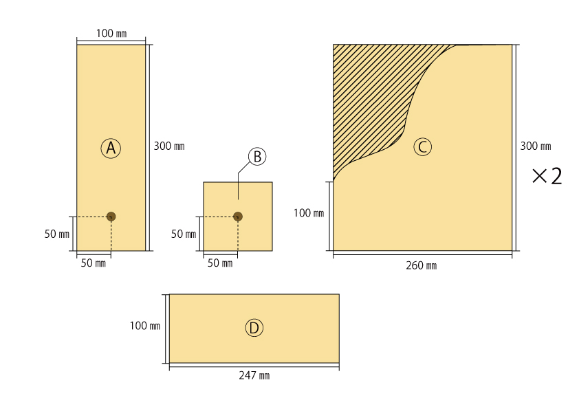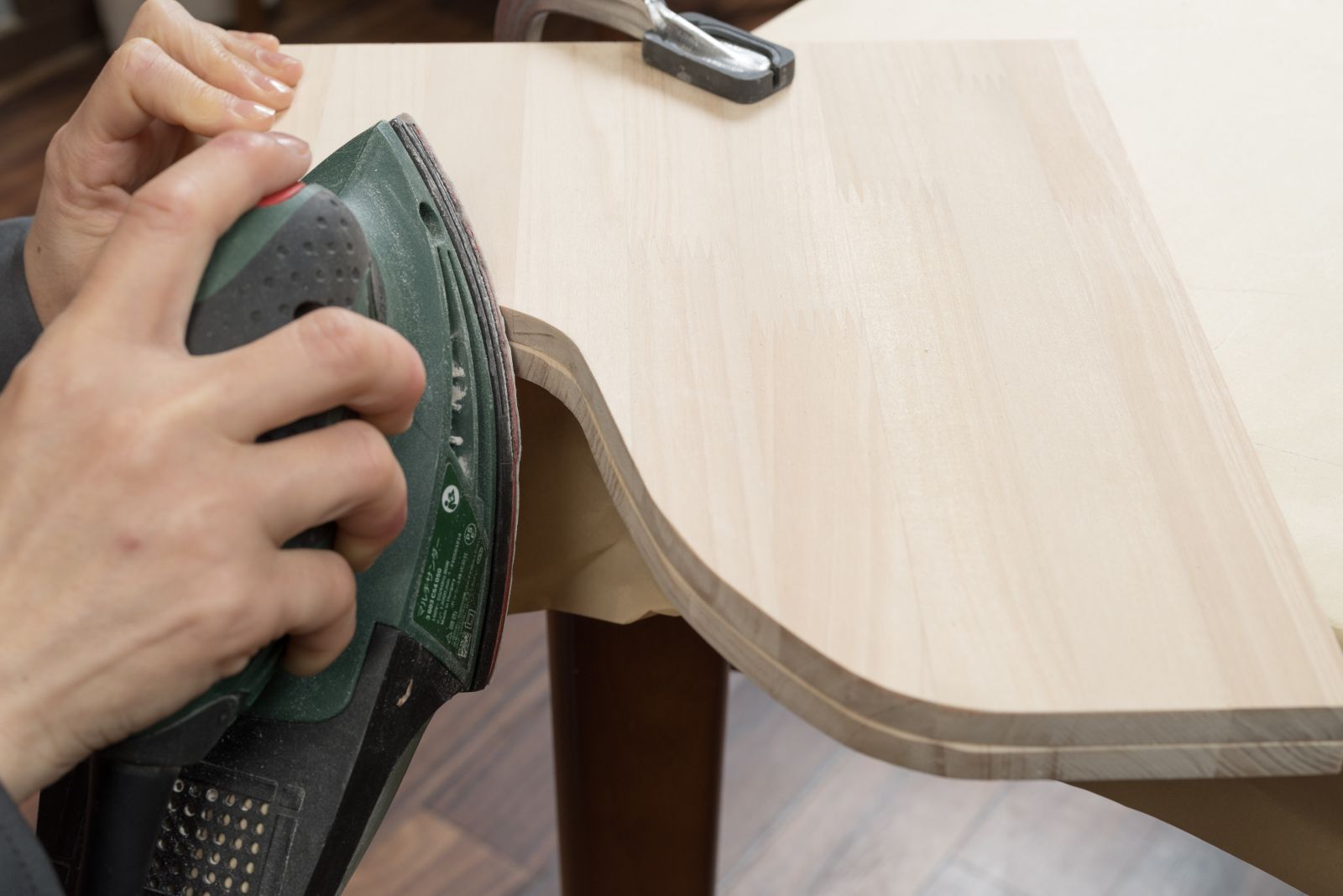 側板となる(C)をジグソーでカットする。安全に作業を行うために、木材はクランプでしっかりと作業台に固定し、ゆっくりと切り進めて。カットした2枚の板を重ねクランプで作業台に固定し、サンダーでカットした部分の形を整え、組み立てた時に外側になる部分の角の面取りをする。