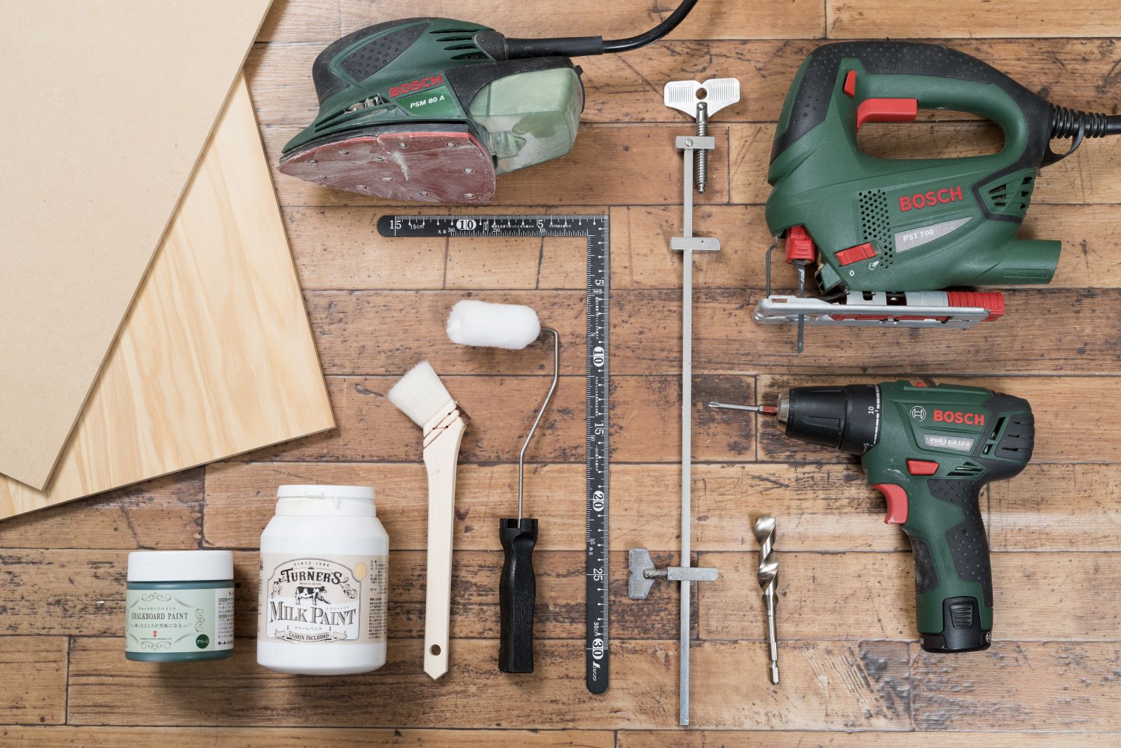 ●電動ドライバー、ジグソー(曲線刃)、サンダー、差し金、ドリルビット(15mm)、ハタ金、木工用接着剤、刷毛、ローラー(2インチ)、ステンシル、スポンジなど