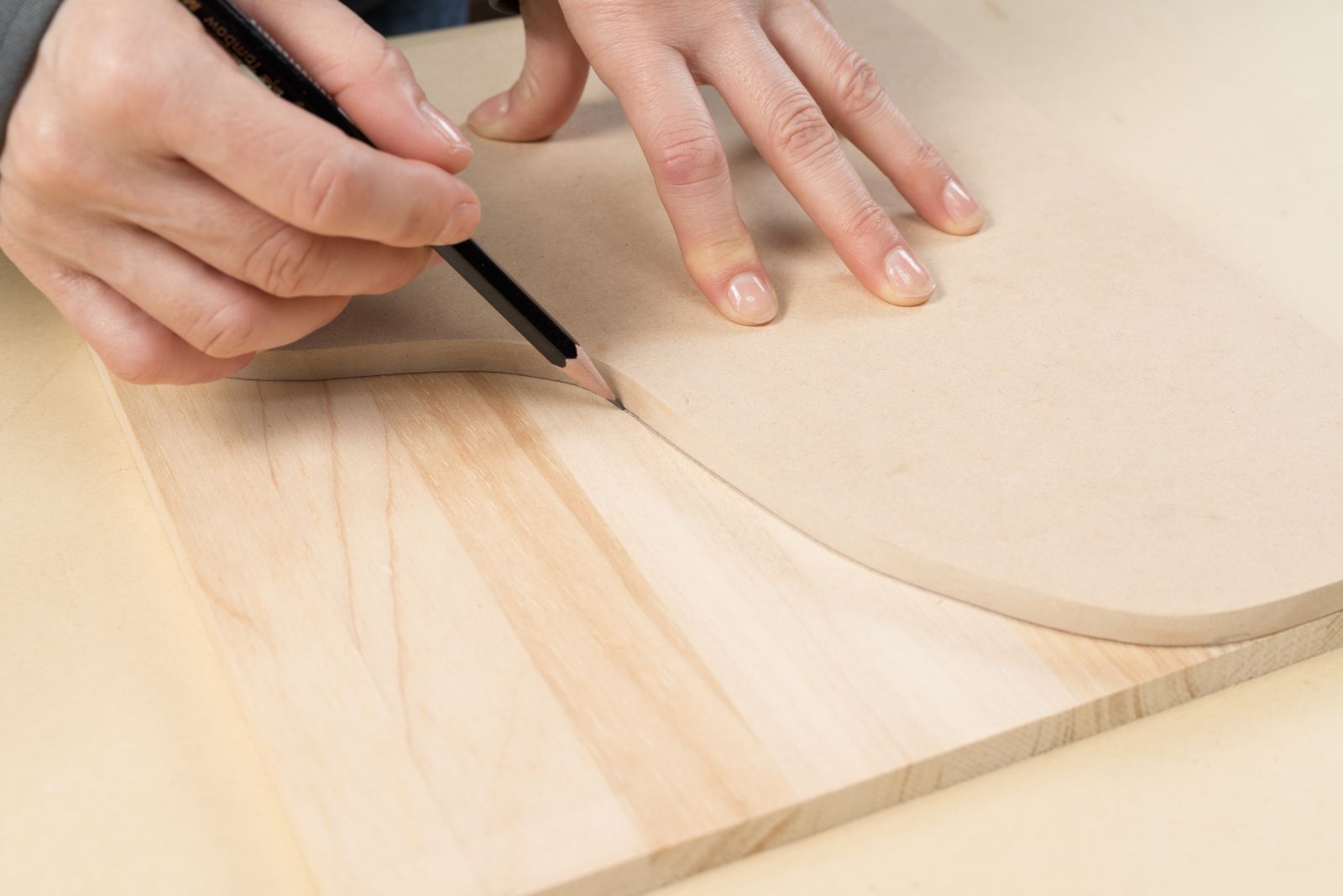 木材を曲線にカットする時は、ジグソーを使うと便利。木材をクランプなどで作業台にしっかり固定し、ゆっくりと切り進めれば、初心者でも安全に作業ができる。特にカーブする部分は、刃先の向きを確かめながら、慎重にカットする。