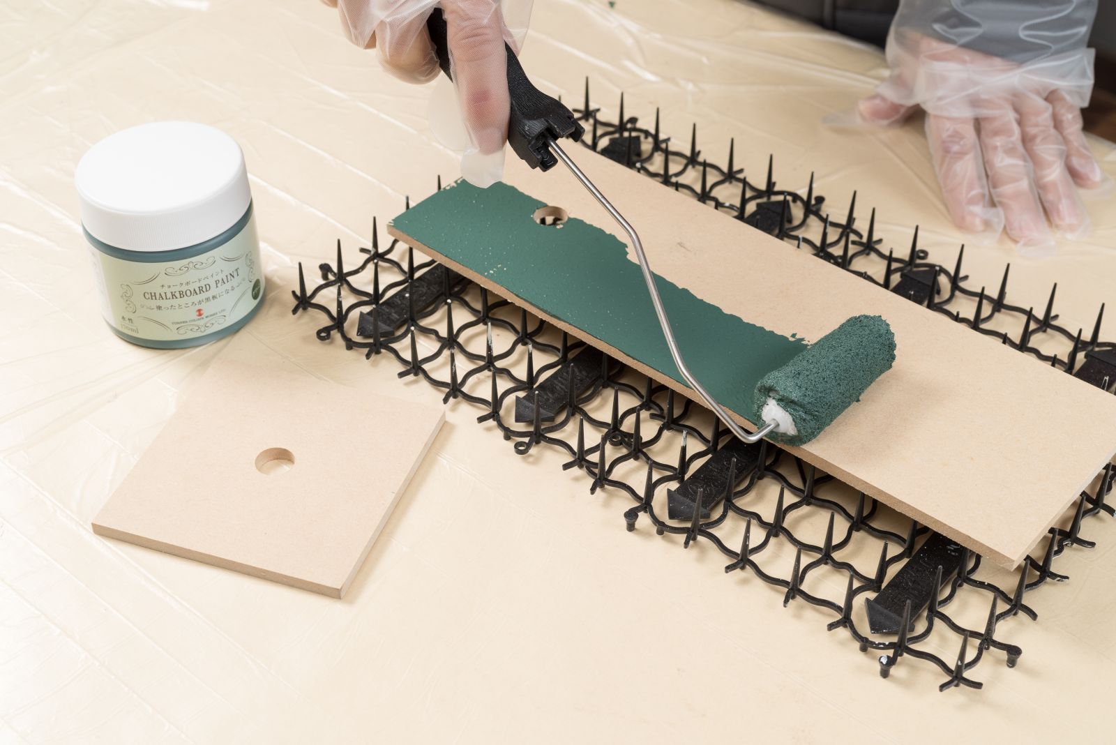(A)(B)はチョークボードペイントで、(C)(D)はミルクペイントで塗装し、乾燥させる。チョークボードペイントはローラーを使い、やさしい力で一直線にムラの無いよう塗るのがポイント。ミルクペイントは刷毛を使い、断面→裏面→表面の順に、木目沿って塗り広げる。チョークボードペイントは完全に乾くまで約2日ほどかかり、その後から黒板として使用できる。