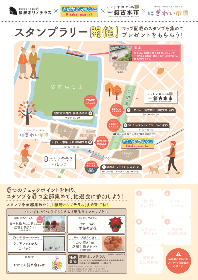 当日は周辺で、「きたかいマルシェ」、「しずおか一箱古本市」、「にぎわい市場 オーガニックカフェ&マルシェ」も開催。各会場のチェックポイントを巡るスタンプラリーもあり。各会場を巡り、5つのチェックポイントでスタンプを5つ集めてハズレなしの抽選会に参加しよう!