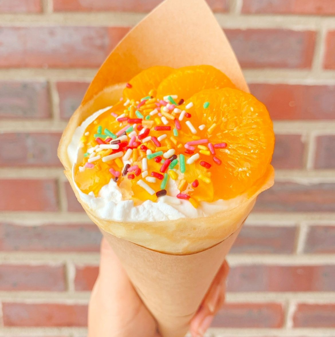 もちもちの生地が自慢の、見た目もかわいらしいクレープ。ボリュームたっぷりで、最後のひと口まで中身がしっかり詰まっている。季節限定メニューも見逃せない。