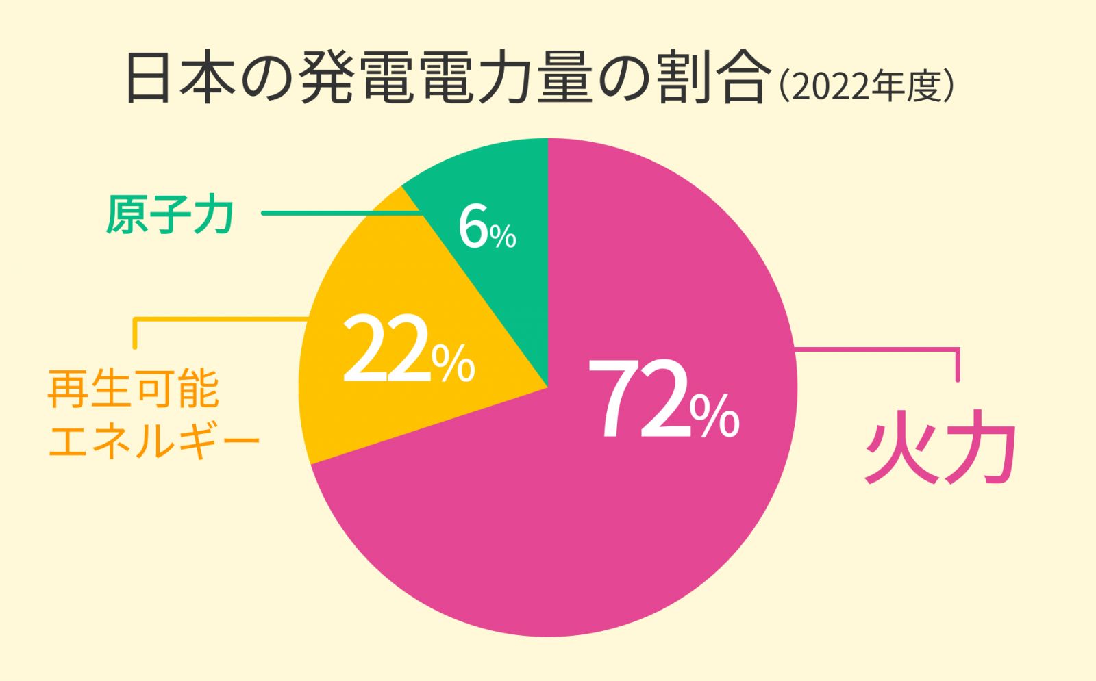 「二人とも着眼点が素晴らしい!ちなみに、2022年度の日本の発電電力量の割合は、火力は72%、原子力が6%、再生可能エネルギーは22%です。火力発電がメインだけど、CO₂の排出量を減らすために、再生可能エネルギーもできるだけ使っているということですね」