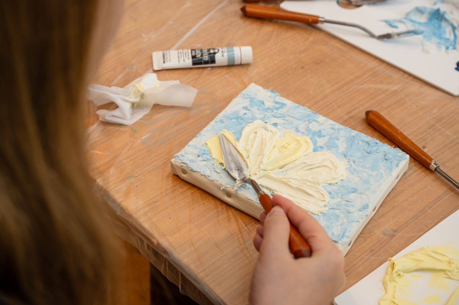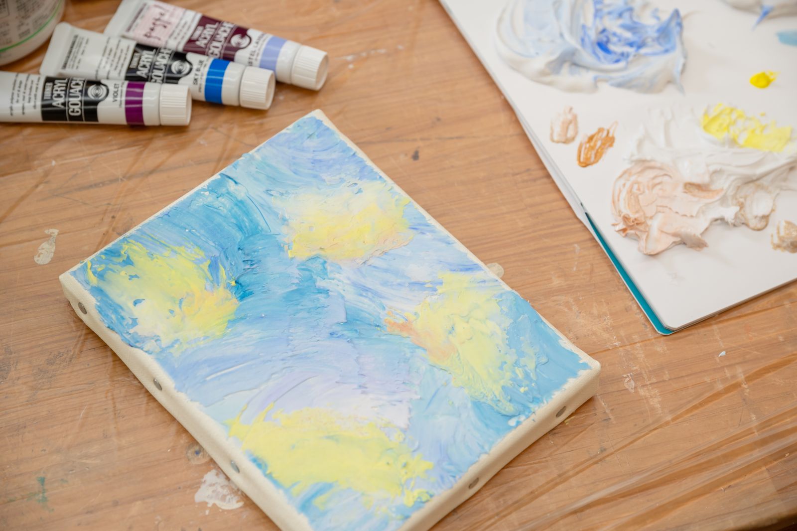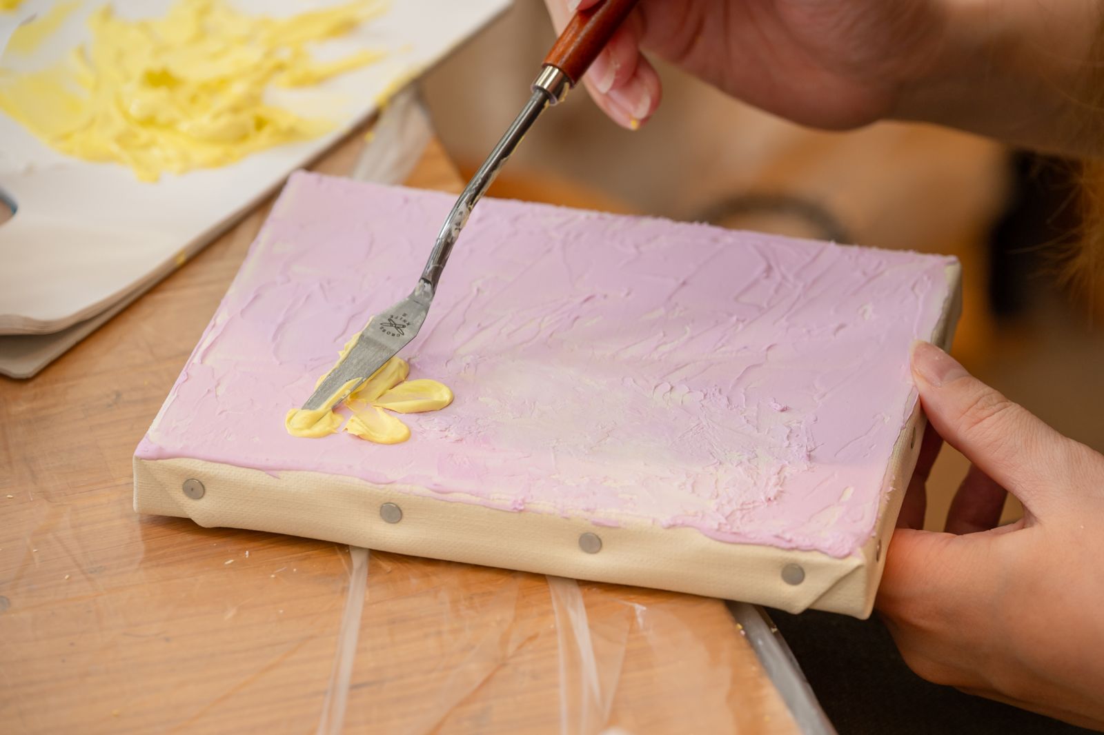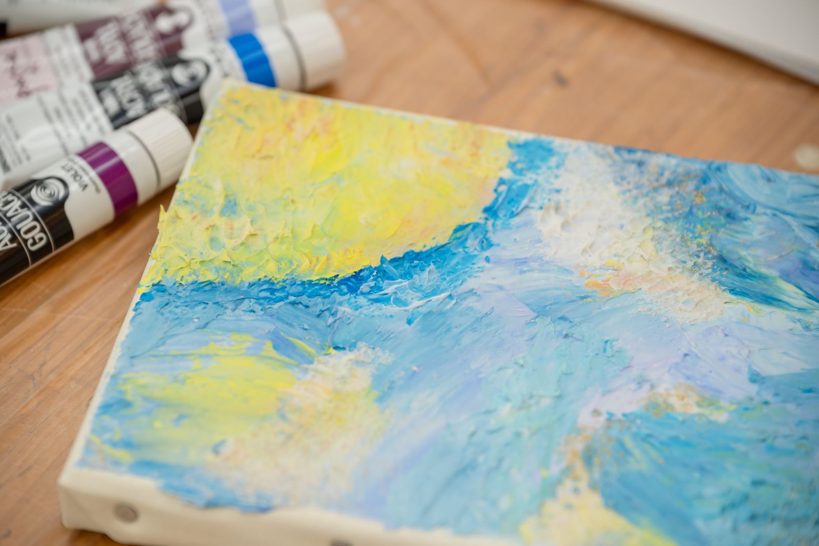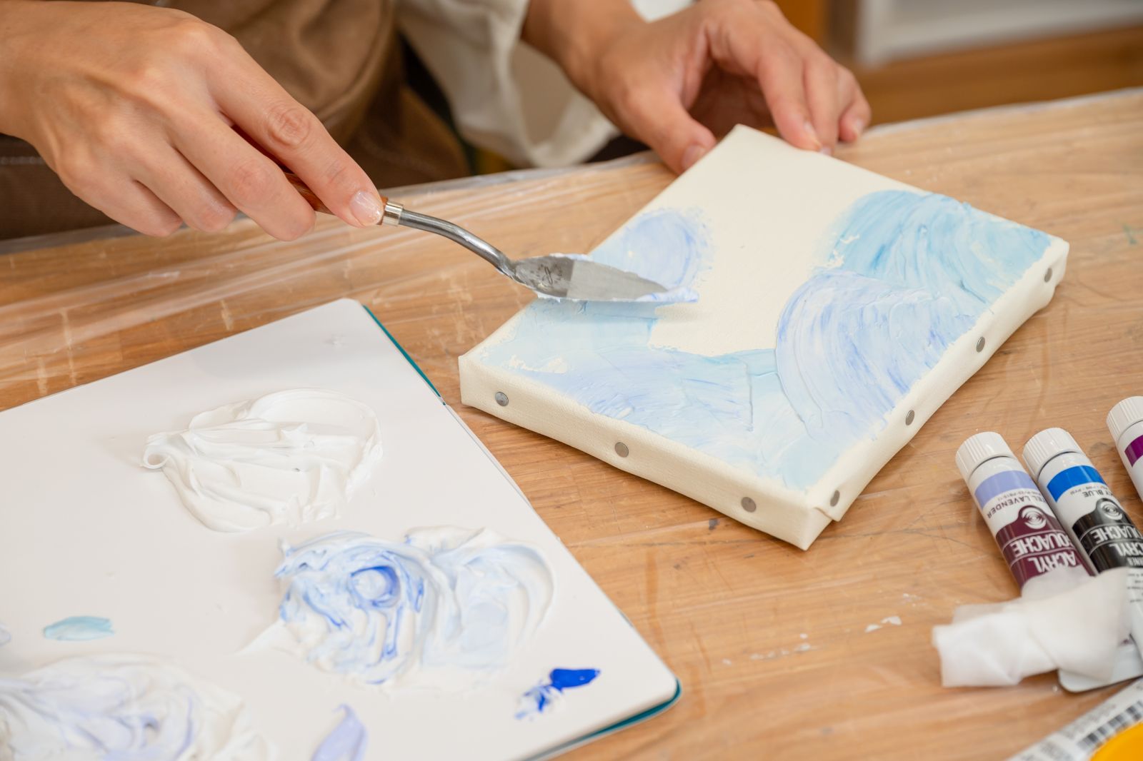 今回はアクリル画材を使って、平面のキャンバスに立体的な絵を描く「テクスチャーアート」にチャレンジする。