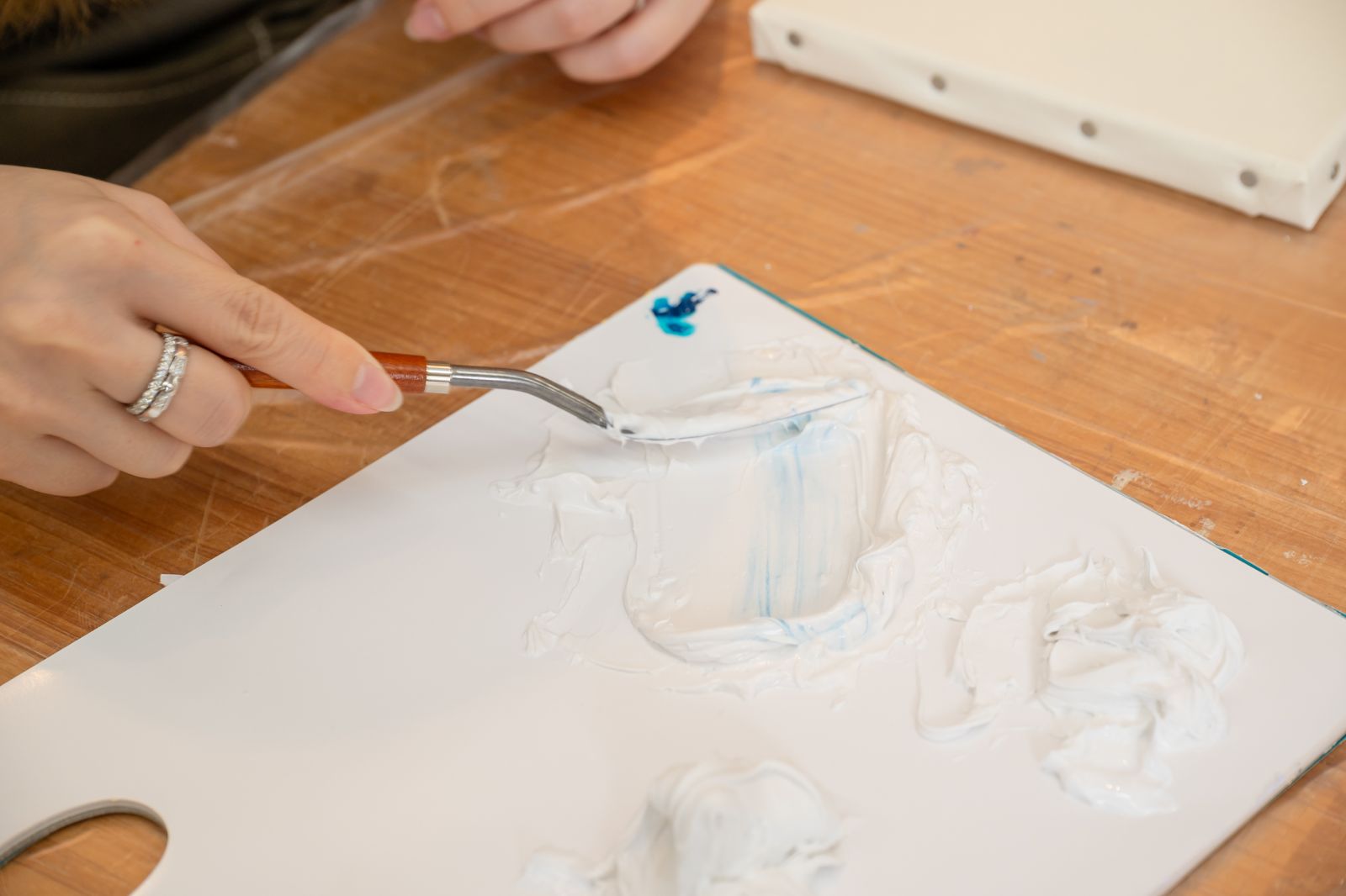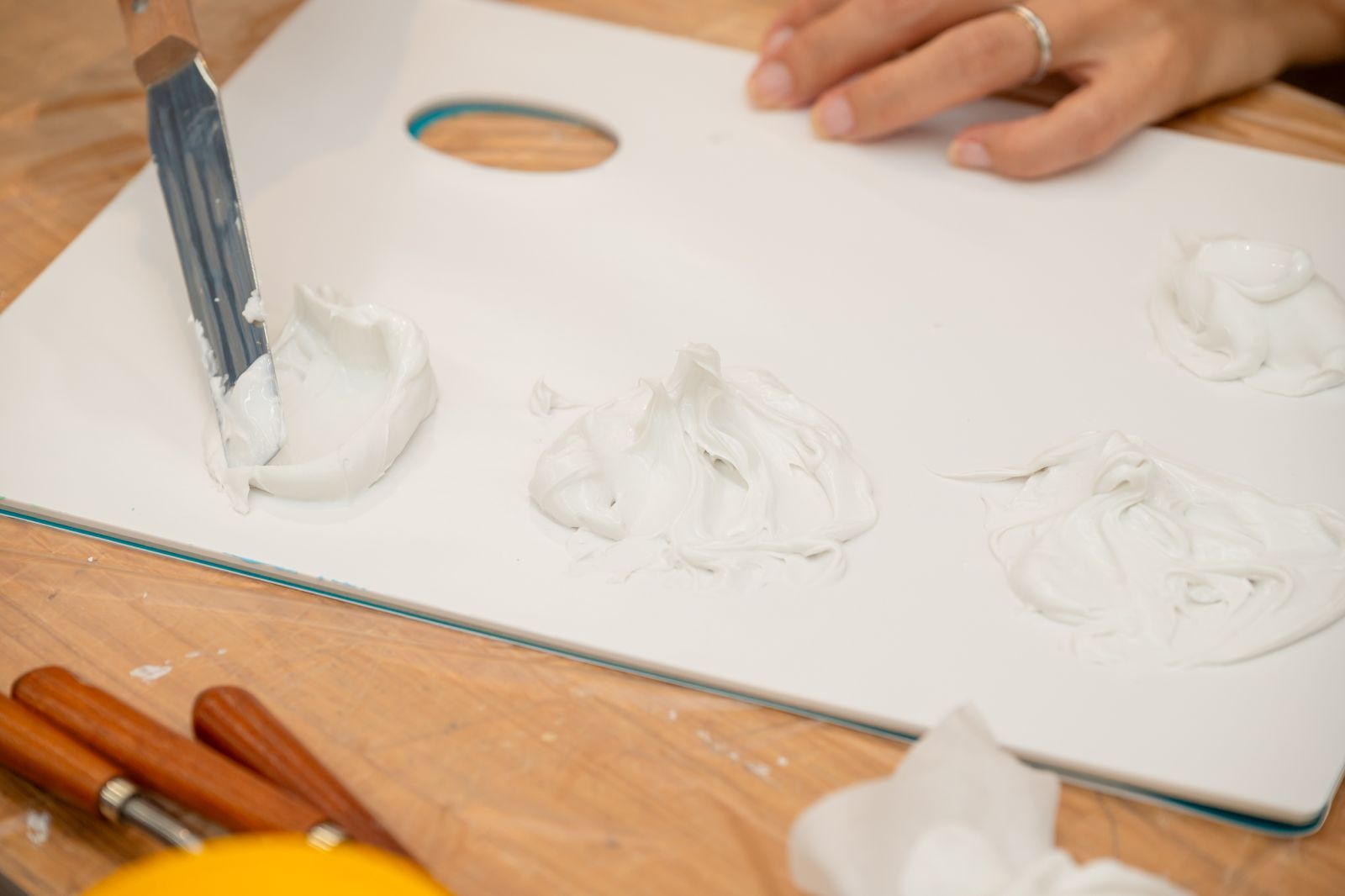 パレットナイフでモデリングペーストを適量取り、ペーパーパレットにのせる。